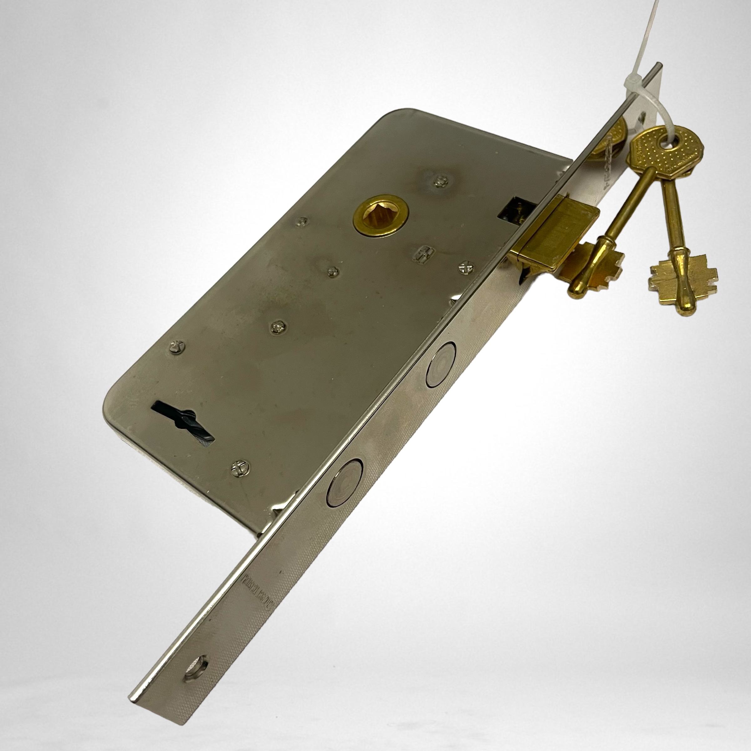 Acytra 101 Cerradura de seguridad dos pernos giratorios caja de 70mm nuez de bronce hierro níquelado.