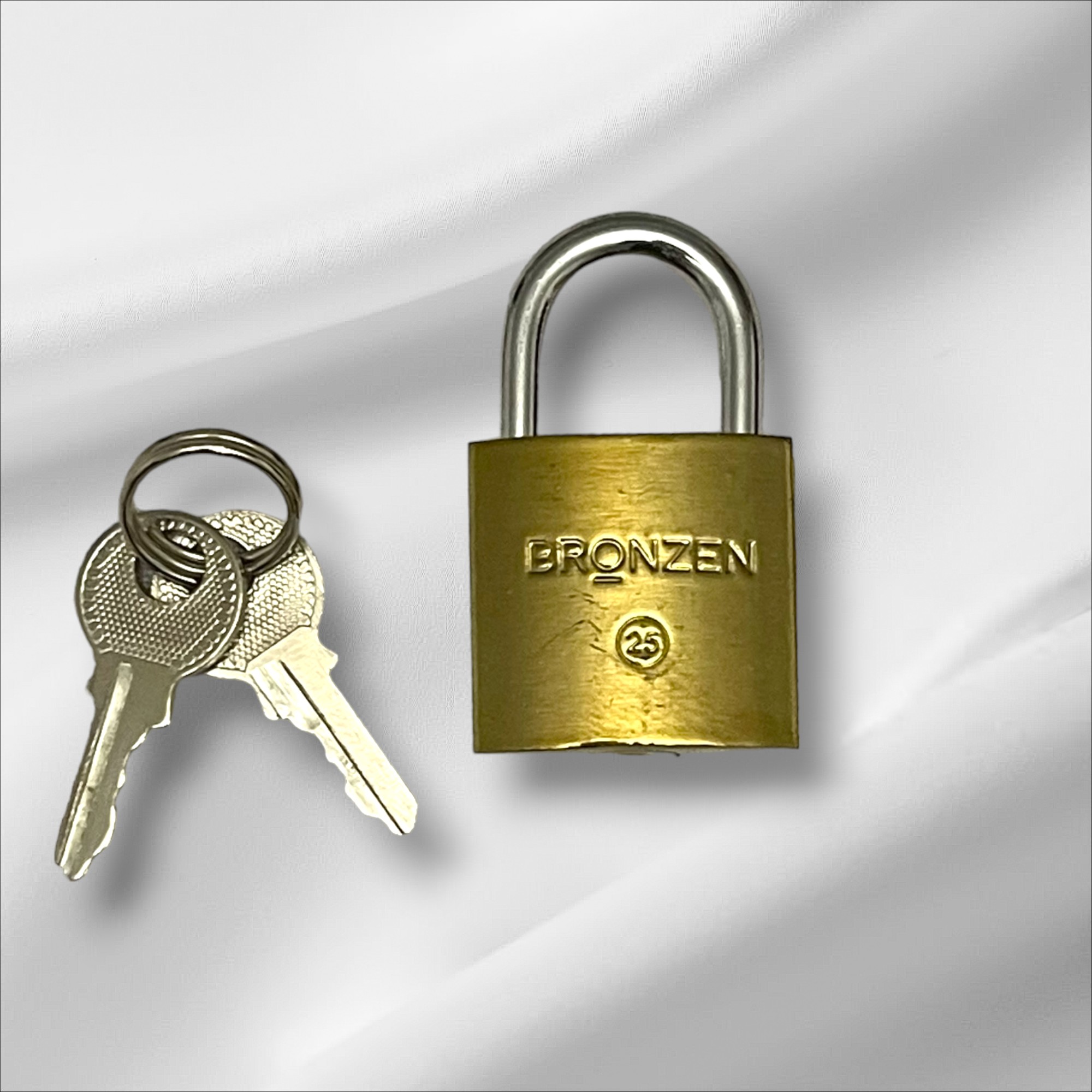 Candado bronceado de 25 mm (incluye 3 llaves). Compra mínima: caja x 12 unidades.