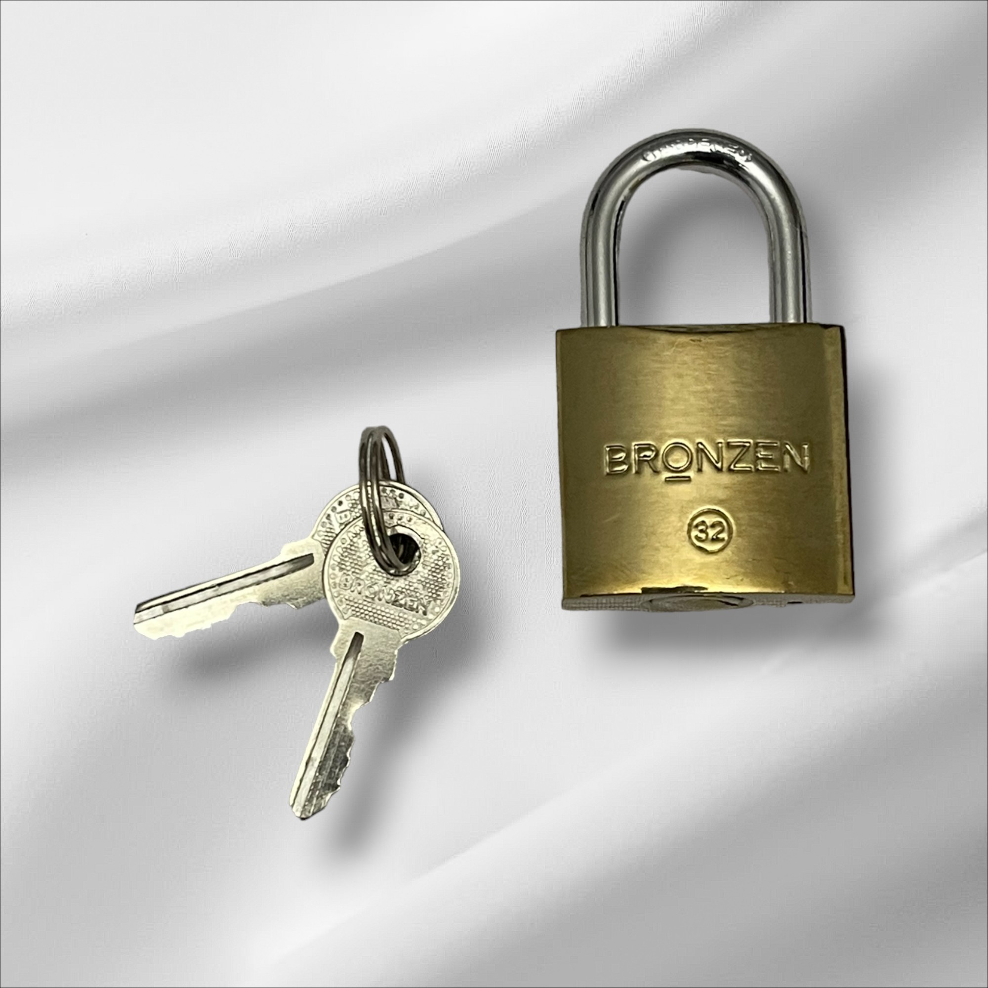 Candado bronceado de 32 mm (incluye 3 llaves). Compra mínima: caja x 6 unidades.