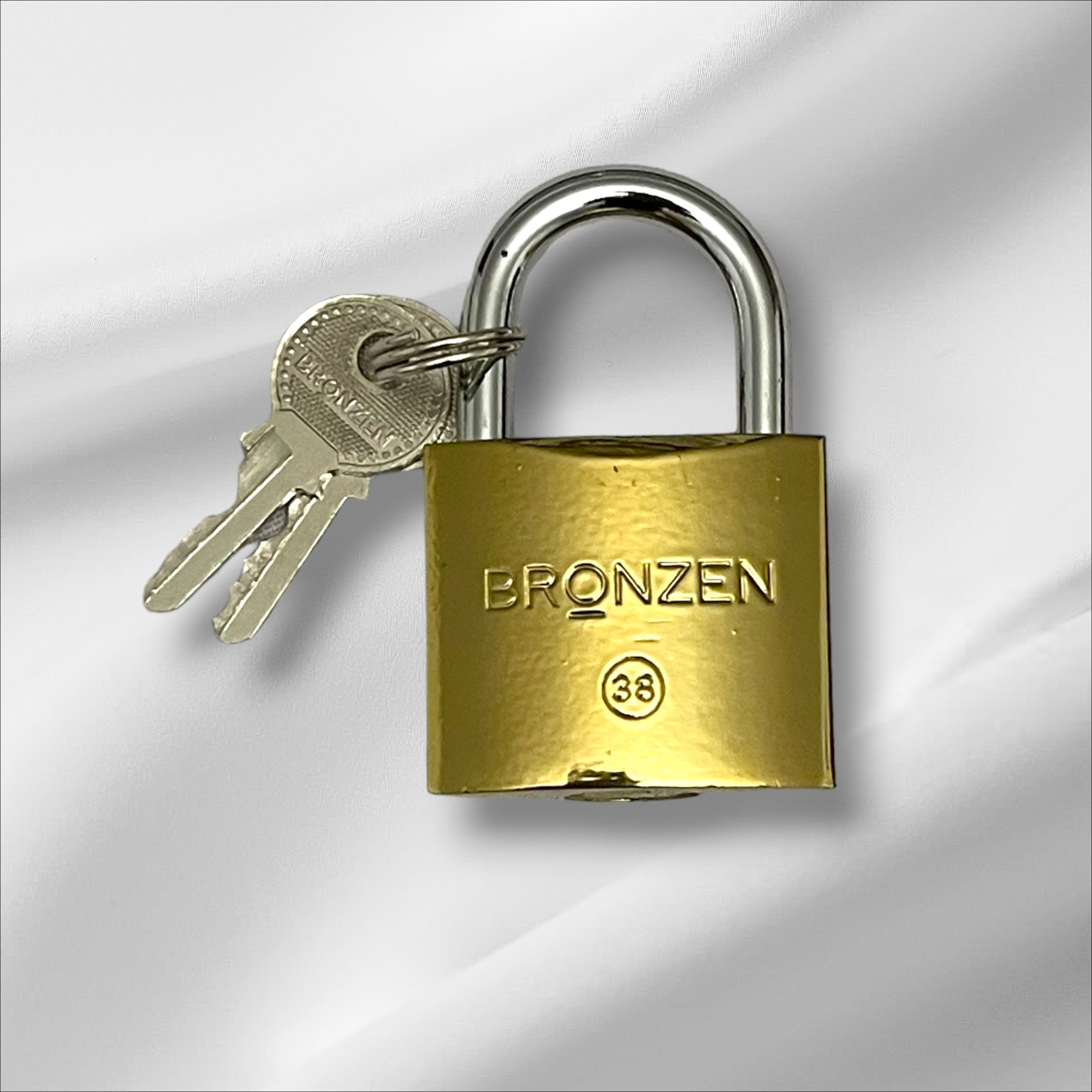 Candado bronceado de 38 mm (incluye 3 llaves). Compra mínima: caja x 6 unidades.