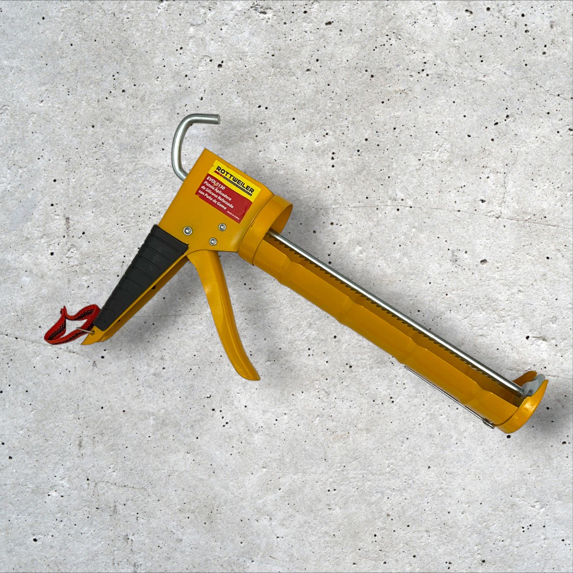 Pistola aplicadora para cartuchos de silicona reforzada con puño de goma.